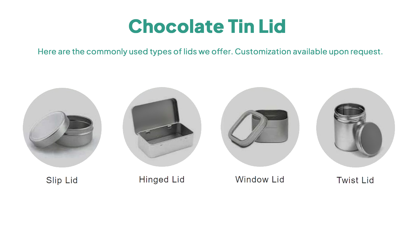 Multiple lid styles are available to enhance both function and presentation. Options include standard solid (slip-on) lids, hinged flip-top lids, clear window lids, and threaded screw-top lids. Hinged lids allow convenient one-hand opening, while window lids let consumers see the chocolates inside without opening the tin. Screw-top lids (and snap-fit lids) provide an airtight, tamper-evident seal. This variety of closures ensures the tin stays securely closed during shipping, while making the unboxing experience both easy and engaging.