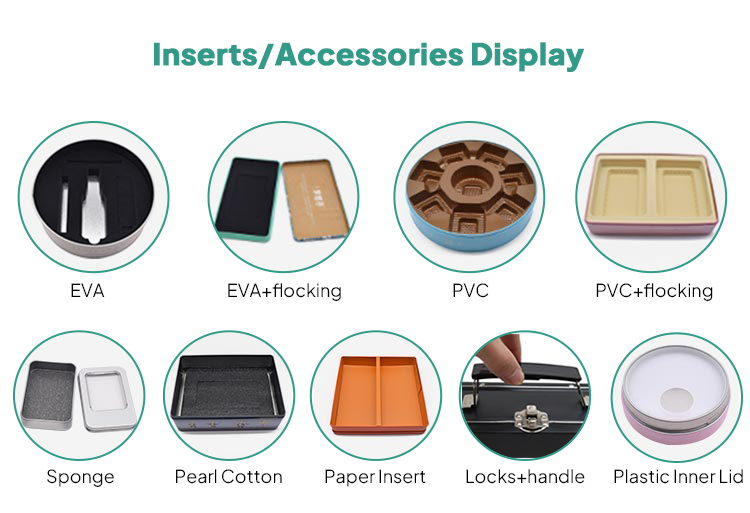 To elevate presentation and protect delicate treats, optional accessories are available. Linings such as plush velvet or smooth satin add a luxurious touch inside the tin. Molded PET or PVC trays, EVA foam, or cardboard dividers can be inserted to cushion and organize chocolates and truffles. We can also equip tins with decorative metal handles, ribbon-tied closures, or small locks on the lid for added security and reuse. These features make the packaging feel like a special gift box while keeping every piece of chocolate securely in place during handling.